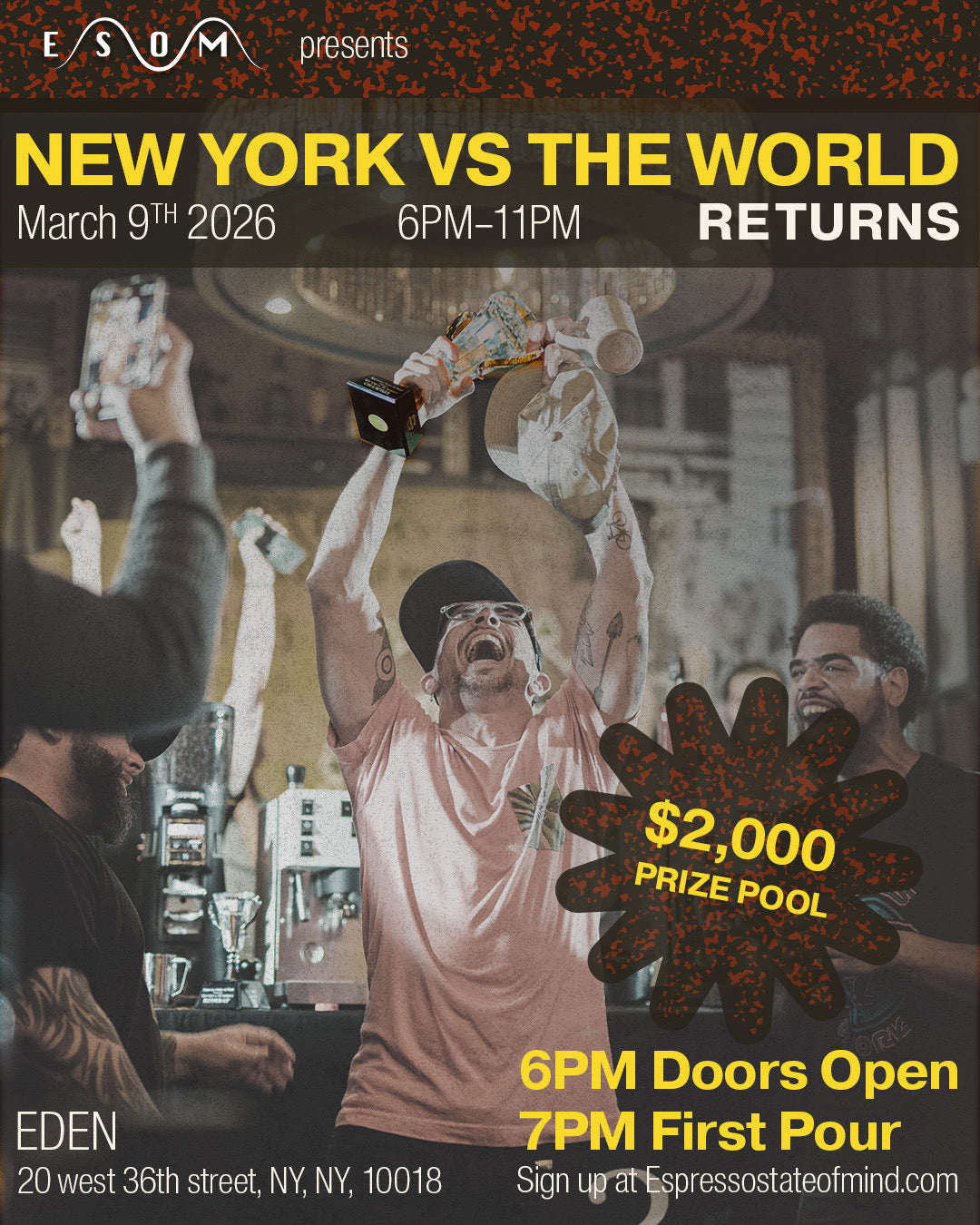 Espresso State of Mind presents New York vs The World Returns, a high-stakes, 64-barista latte art throwdown hosted at EDEN in the heart of New York City.